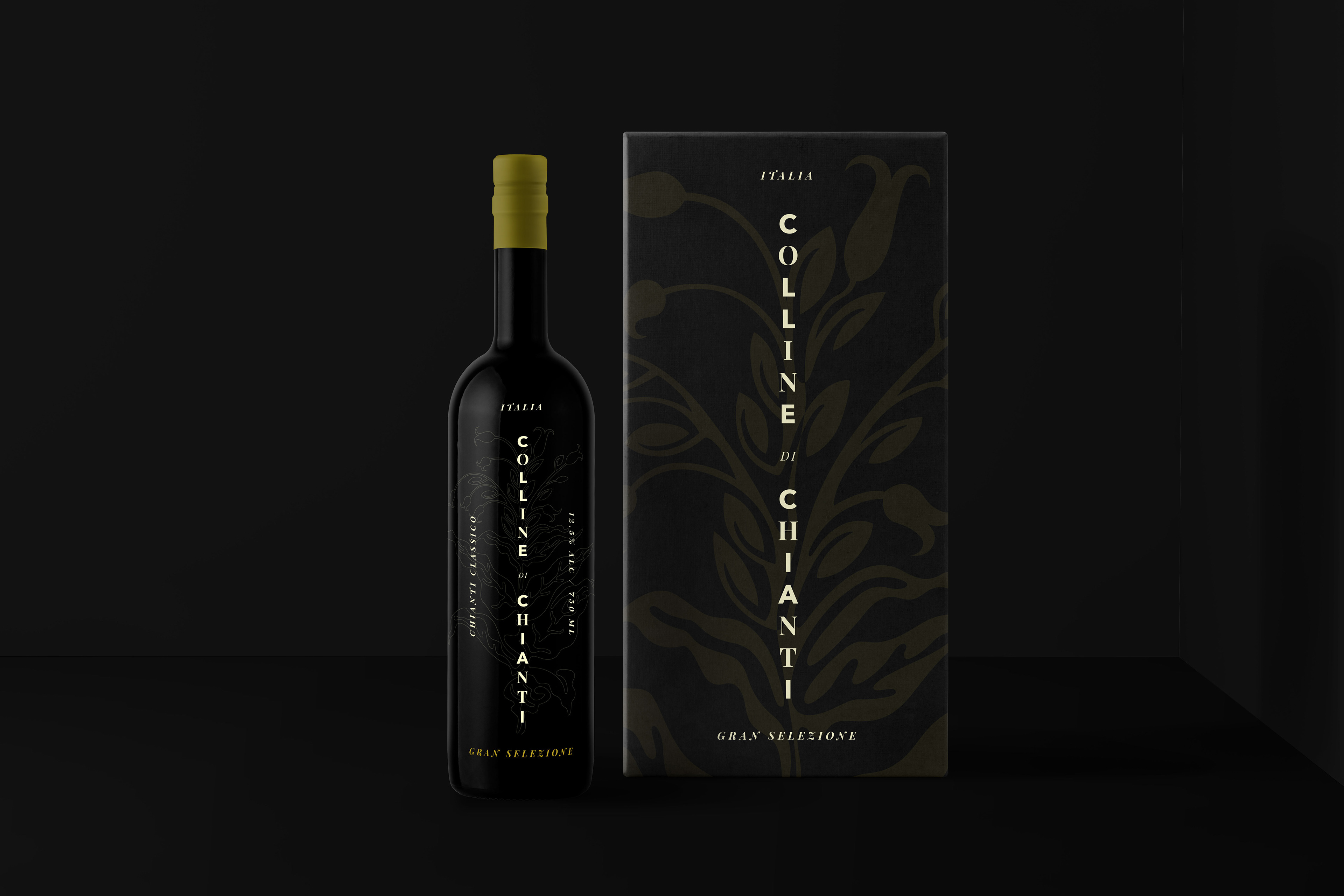 A sleek and understated design with an intricately playful illustration separates the Colline di Chianti bottle from the mannered or boring labels seen on shelves around the world. Each bottle bears its own color and ghosted single-line illustration that brings attention to the main note of each wine — Gran Selezione is a smoky tobacco and an earthy green olive; Riserva is a sweet cherry and tangy crimson; Superiore is a tannic coffee and silky purple; and Chianti is a strong oregano and an intense green. The boxes exhibit a filled version of each illustration in the color corresponding with the main flavor.